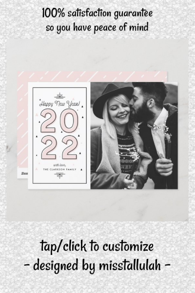 Happy 2022! Send your New Year wishes to family and friends with this stylish and unique "Happy New Year" photo flat card. It features pink geometric typography and stripes pattern. Customize this New Year card by adding your own photo and names or short texts. This holiday photo card is available in other colors and cardstock. myMostlyEverything