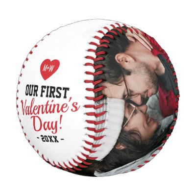 Cute 1st valentine's day baseball gift featuring a red love heart with you and your partners initials the text "our first valentines day!" and the year. Plus 2 photos for you to customize with your own to make this an extra special boyfriend gift. myBaseball