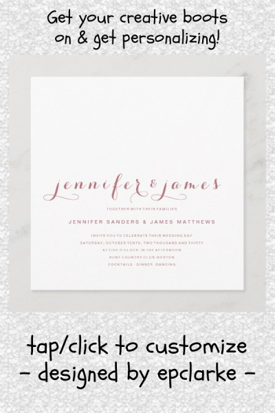 Square photo wedding invitation design. For couples who want a minimal simple yet elegant wedding invitation design. Elke Clarke © The design features the bride and groom names in an elegant script font. Shown in rose gold and white but can be customized to your wedding colors for the text and background. Add any other graphics photo or monogram to you personalize this template. myMostlyEverything